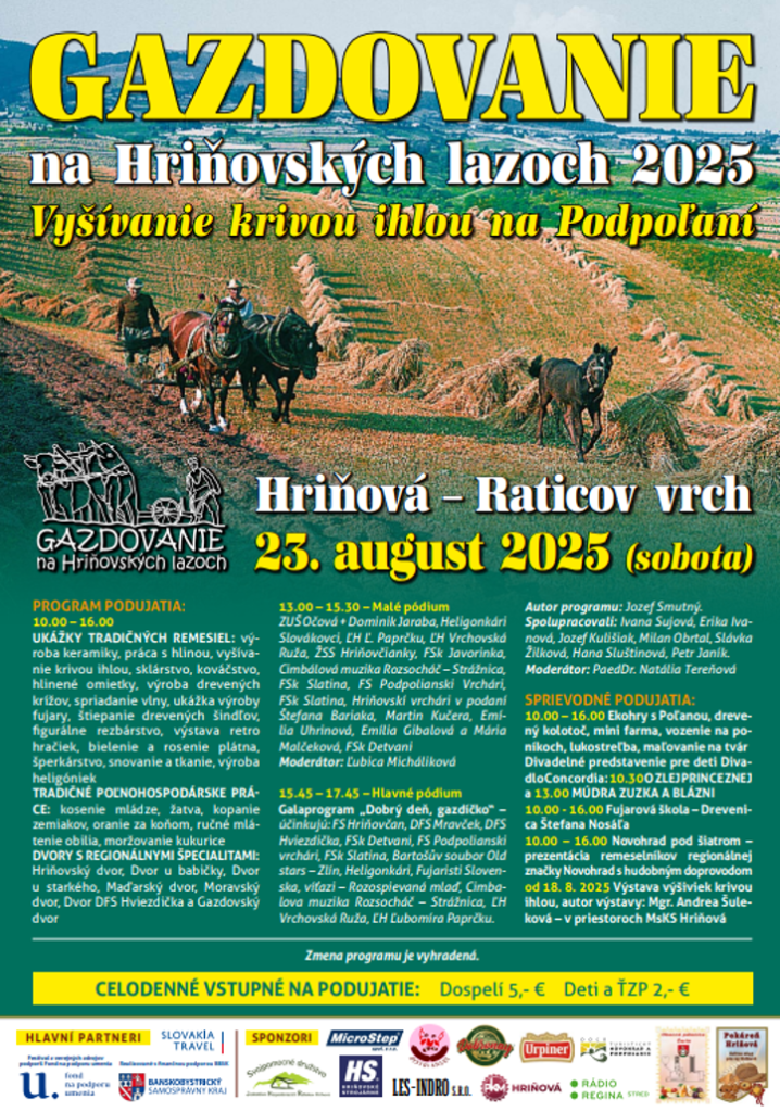 13:00-15:30 - Malé pódium ZUŠ Očová + Dominik Jaraba, Heligonkári Slovákovci, ĽH Ľ. Paprčku, ĽH Vrchovská Ruža, ŽSS Hriňovčianky, FSk Javorinka, Cimbálová muzika Rozsocháč - Strážnica, FSk Slatina, FS Podpolianski Vrchári, FSk Slatina, Hriňovskí vrchári v podaní Štefana Bariaka, Martin Kučera, Emília Uhrinová, Emília Gibalová a Mária Malčeková, FSk Detvani