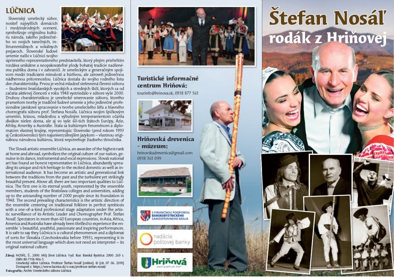 Vďaka podpore ,,Nadácie Poštovej banky“ a miestnych dobrovoľníkov sa mestu Hriňová podarilo úspešne realizovať projekt pod názvom ,,Štefan Nosáľ rodák z Hriňovej“. Hlavným zámerom bolo vzdať úctu celoživotnému dielu a osobe prof. Štefana Nosáľa. Miestni obyvatelia, ako aj obyvatelia Slovenska sú na túto osobnosť slovenského folklóru mimoriadne hrdí a bolo nám preto cťou realizovať projekt, ktorý bežnému návštevníkovi ozrejmí viac o jeho živote. Našou prvoradou snahou bolo vytvoriť pamätné miesto, kde neďaleko neho stál rodný dom Štefana Nosáľa. Na tomto pamätnom mieste sme spolu s dobrovoľníkmi vytvorili a osadili drevenú lavičku s jeho menom a údajmi o narodení a úmrtí. V blízkosti lavičky bola taktiež osadená drevená fujara, ako symbol Podpoľania a jeho lásky k folklóru a tradíciám. Pamätné miesto bolo slávnostne otvorené 17. augusta 2018 za prítomnosti primátora mesta Hriňová, rodinných známych a priateľov Štefana Nosáľa, ako aj širokej verejnosti. Odzneli príhovory zúčastnených hostí a pripravený bol aj krátky kultúrny program v podobe ľudových piesní, hudby, hry na fujare a heligónky. Pamätné miesto narodenia Štefana Nosáľa sa zároveň stalo súčasťou náučného chodníka vedúceho k vodopádu Bystrô. Osadené boli preto stále náučné tabule o jeho živote a pôsobení v súbore Lúčnica. Súčasne boli vytlačený roll up a bulletíny s mapkou a informáciami o živote Štefana Nosáľa, ktoré boli umiestnené v miestnych turistických informačných strediskách a budú k dispozícii aj v pripravovanom múzeum Štefana Nosáľa v Hriňovej.