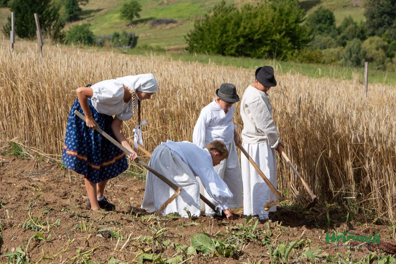 Tradičné poľnohospodárske práce: Návštevníci sledovali oranie za koňom, kosenie mládze, žatvu, ručné mlátenie obilia a moržovanie kukurice.
