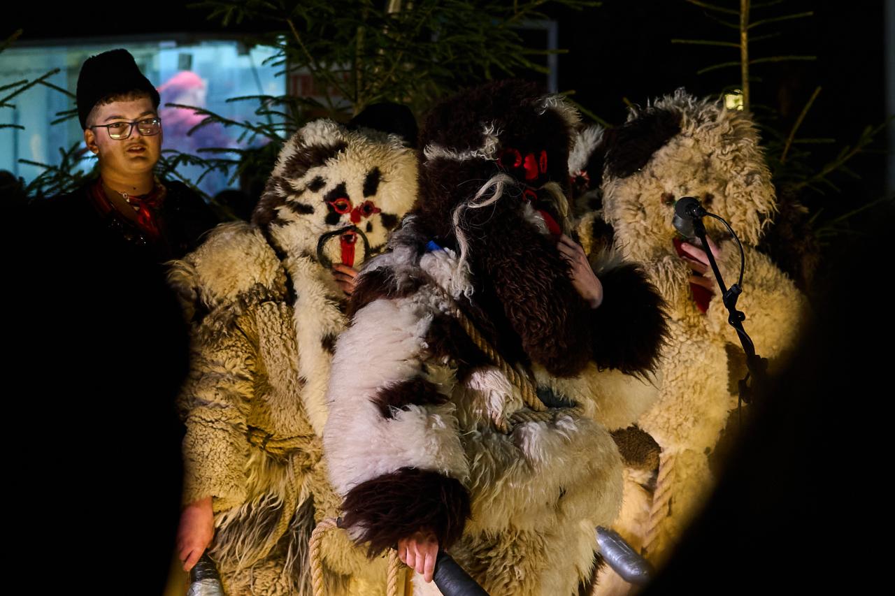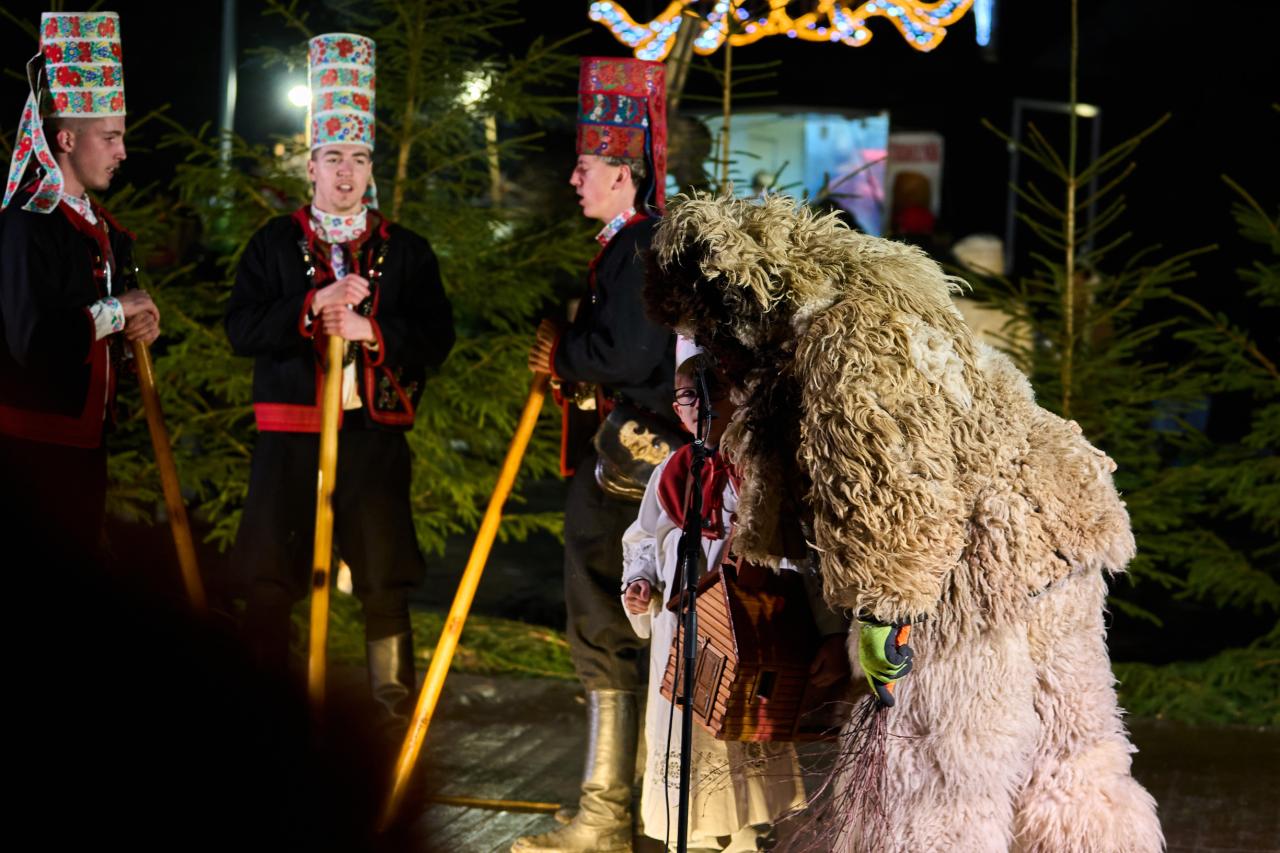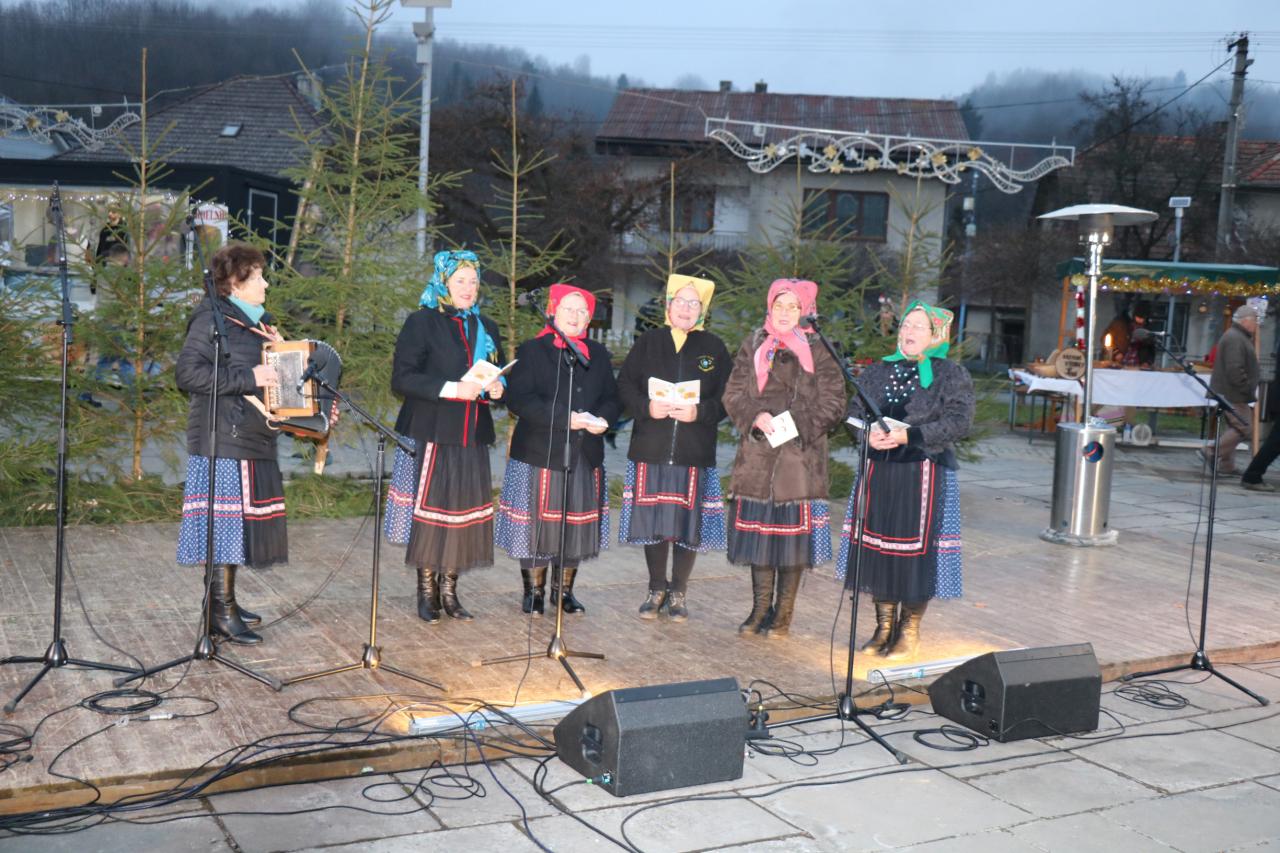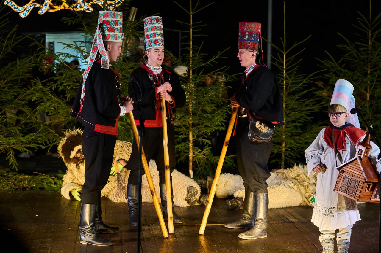 Tradičný spev a hudba: Ženské spevácke skupiny a folklórne súbory (FSk Javorinka, ŽSS Hriňovčianky) v krásnych krojoch a šatkách priniesli na námestie hriňovské koledy a piesne za sprievodu heligónky a akordeónu.