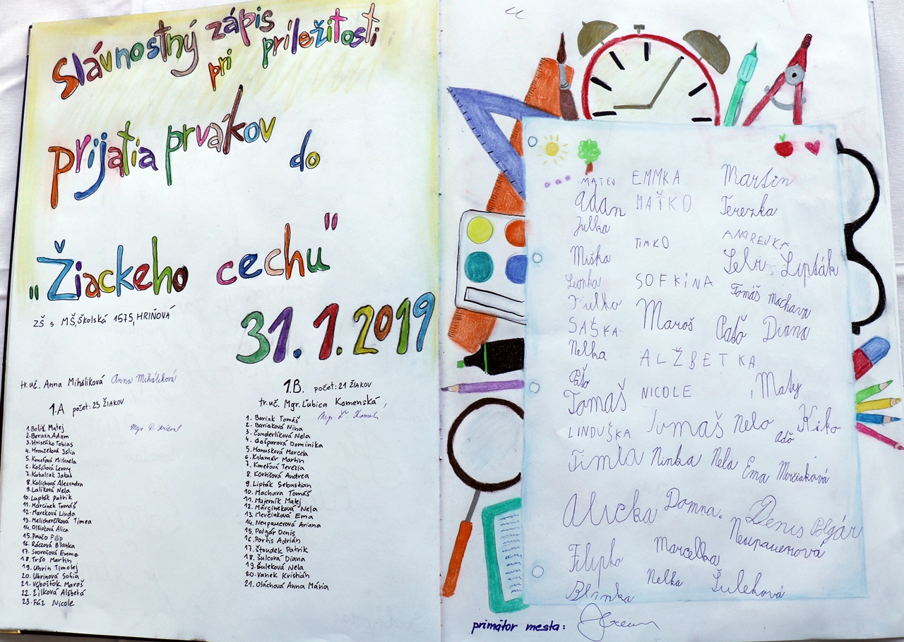 Dňa 31. 1. 2019 v Obradnej sieni Mestského úradu Hriňová prijal primátor mesta žiakov prvého ročníka Základnej školy s materskou školou na ul. Školskej a Základnej školy s materskou školou v Krivci, ktorí si prevzali svoje prvé vysvedčenie.