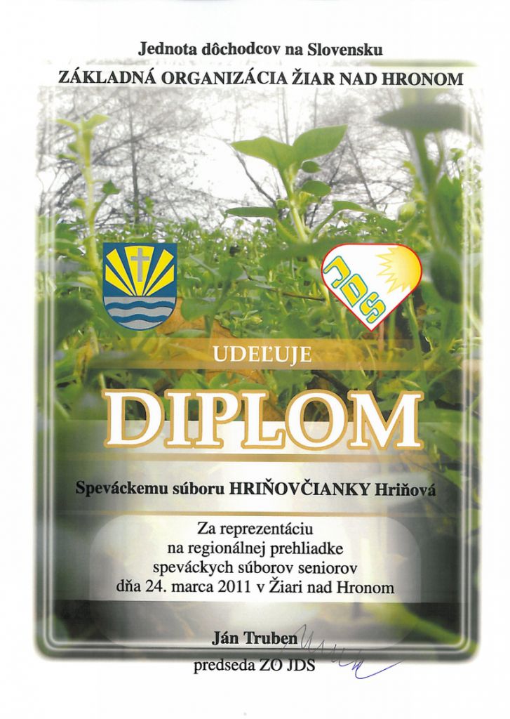 Dňa 24.marca 2011 sa v Žiari nad Hronom konala "Regionálna prehliadka speváckych súborov seniorov" z okresov Detva, Žarnovica a Žiar nad Hronom za účasti jedenásť súborov. Našu ZO JDS reprezentovala ženská spevácka skupina "HRIŇOVČIANKY", ktorej vedúcou je pani Emília Rezníková. Skupina vystupovala v krojoch a reprezentovala nielen našu ZO JDS, ale aj mesto Hriňovú. Za vzornú reprezentáciu ďakujeme "Hriňovčiankam" aj touto cestou.