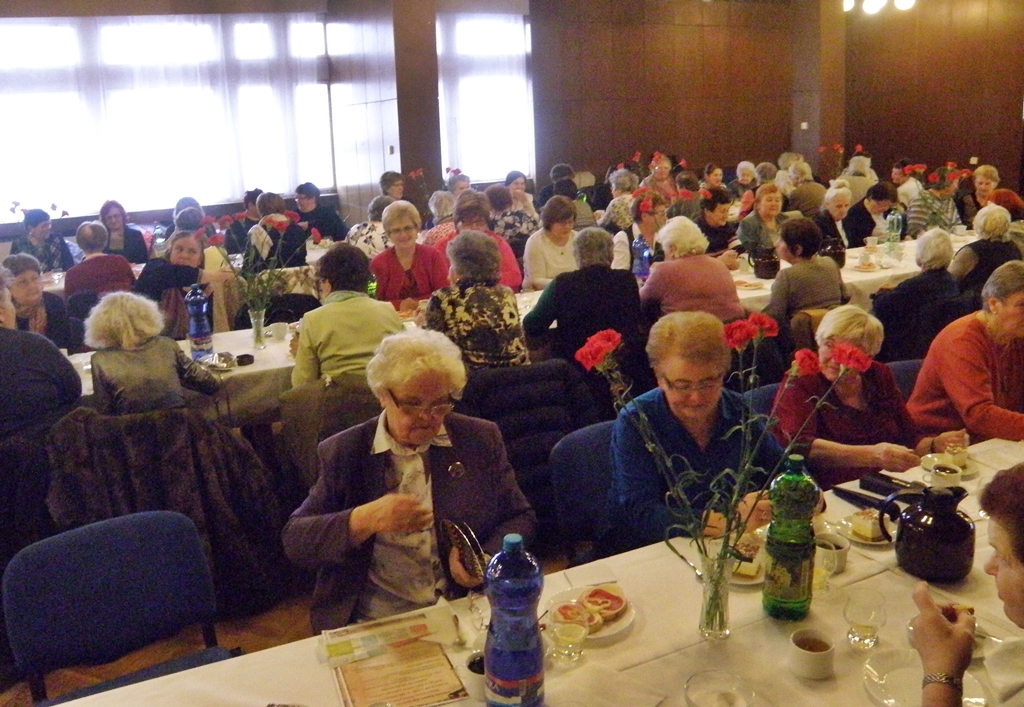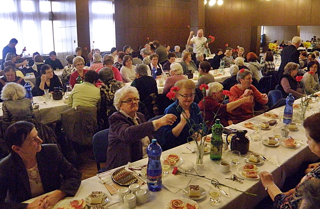 Každá účastníčka obdržala z rúk predsedu ZO JDS Ing. Petrusa, prednostu MsÚ Mgr. Ďuricu a člena Revíznej komisie ZO JDS pána Ľalíka červený klinček s gratuláciou k MDŽ.